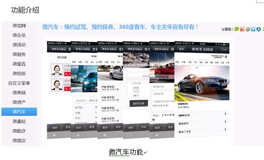 微汽车是微易销针对汽车行业的需求,开发汽车行业微信服务系统。微汽车采用微易销平台进行汽车的销售管理、预约保养、预约试驾、保险计算、车贷计算、车型比较、违章查询、360度全景看车、车主关怀等功能,整个过程非常便捷,省时省力省心,并通过与微易销平台有交互能力的手机客户端,快速便捷的实现了商家的销售管理与预约过程,同时也实现了客户无需进入4s店就能进行预约保养和试驾的功能。微易销还可以在微信端建立微信车友会,实现车友们的在线交流和互动,也提升汽车品牌的凝聚力。