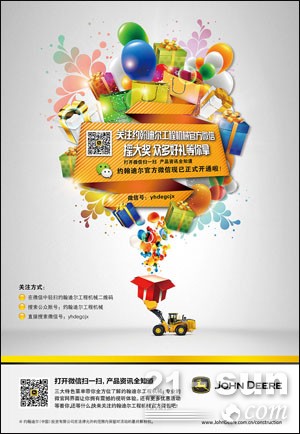 据中国工程机械商贸为那个编辑了解,约翰迪尔微信平台将与客户分享企业动态、产品信息、优惠活动、售后信息等相关资讯。你想约翰迪尔的第一手资讯吗?你想参与约翰迪尔专属活动吗?你想随时随地了解约翰迪尔的产品信息吗? 那就立刻关注约翰迪尔微信平台吧!
