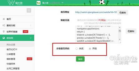 此外,笔者通过强大微相关人士了解到,开通微分享功能步骤非常简单,只需要一个操作即可实现;开通微信号并与强大微后台对接的企业,进入微官网模块,在网站设置页面中分享功能,您的微官网就可以通过微共享功能分享到各个网站了。