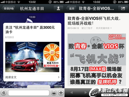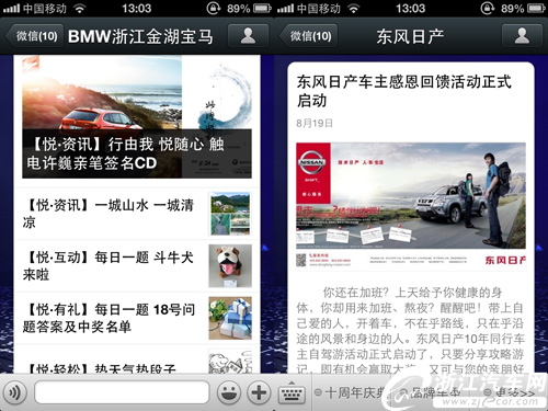 在这个价格竞争越来越激烈、4s店开设成本越来越高昂、客户流失越来越严重的现下,点对点的微信营销,在汽车行业将会越来越盛行。尤其是对于沉闷了数月的杭城车商们来说,面对即将到来的传统销售旺季“金九银十”,自然会推出各式花样百出的优惠促销信息。而微信,也就毫无悬念地成为了他们宣传推广的重要战场之一。