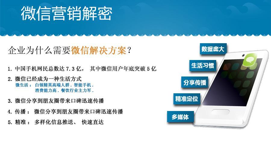微信海, 微信全套解决方案提供商,迄今研发出业内领先的移动互联网营销及微信营销云平台,独家研发57个行业落地微信解决方案,138家大品牌客户,116375个中小客户,丰富的客户服务经验,是国内最早被认可的,最受信赖的微信专业解决方案服务公司,是联合国全球中小企业联盟全球唯一指定微信服务商,荣获新华网颁发2013中国信息化年度领军企业,旗下拥有畅销书《微信营销解密》、《微信营销与运营攻略》。