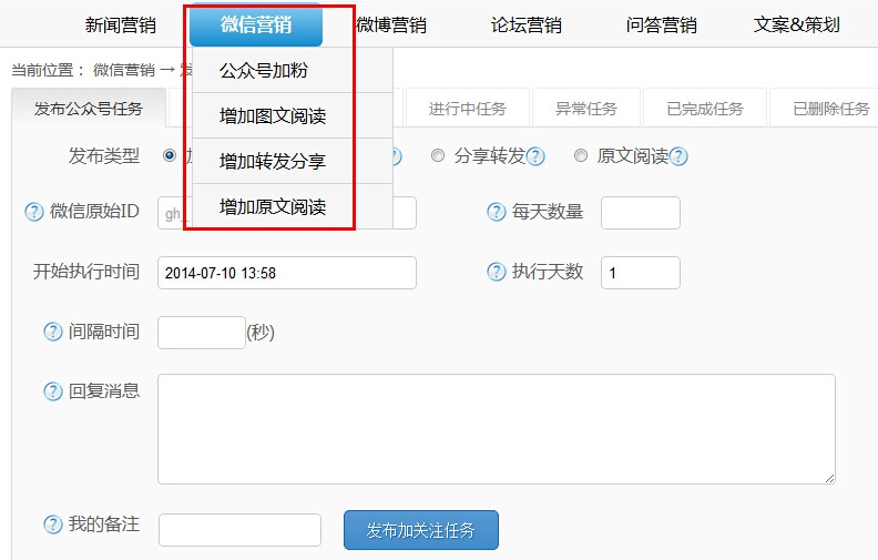 现在有很多企业都借助第三方平台来运营操作微信号,博洋微信营销平台为各行业企业提供微信营销,主要还是针对公关公司的营销策略,可以根据公关公司的需求刷一定量的粉丝,如果你是公关公司的一员,相信你一定需要博洋来帮你完成业务需求,如果是企业号,可以通过刷粉这个强大的功能来帮你认证!而且这个平台不光只有微信营销,还有微博营销,论坛营销,新闻稿营销,问答营销等,博洋微信营销平台是奇博科技(微信号:softweibo,新浪微博@奇博精准互动营销)的一个一站式营销平台(http//pomg.softweibo.com)进行微信号推广的,效果非常不错!