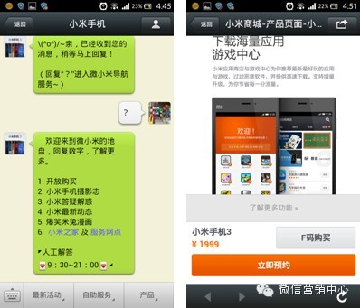小米问世以来,利用疯狂的饥饿营销模式,赚足了眼球,也获得了巨额的销售业绩。小米紧抓移动互联网营销趋势,积极接触了微信账号并一发不可。小米手机微信号,可直接实现小米各型号手机的预约购买,可进行话费充值和订单查询……