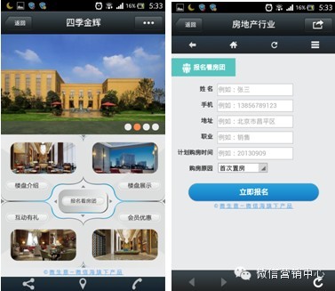 四季金辉是行业内比较早试水微信的地产之一。上线初期,只是尝试着在开盘的时候引进了微信大转盘抽的活动,没想到效果出其意料的好:六千多人同场抽,抽得了各种品比如购房代金券丶实物大。由于微信抽活动的刺激,当期开盘成交量远远超过预期。紧接着,四季金辉账号相继完善了各项功能,包括微信端报名看房团丶微信会员卡丶图片墙丶周边生活设施等等,并进行了线上丶线下各种渠道推广。