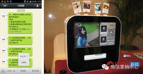 在自助印终端前,拿出智能手机,扫描并关注印美图的微信账号,发送手机照片给它。然后,输入屏幕上显示的微信验证码,它能在30秒内接收照片,制作出一张宝丽莱风格的LOMO卡,并从终端的窗口“掉落”下来。在手中的智能手机就变成一部拍立得,而这个无线装置就像一个“暗房”,帮你把“底片”在片刻之间冲印成相。