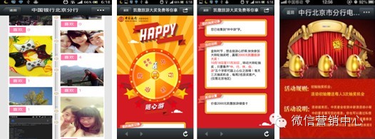 “中国银行分行”微信号是中国银行携手微信海公司在微信端的试点,今年6月份正式上线以来,每个月都策划运营了大型的主题活动,比如6.7月份的“招兵买马”丶8.9月份的“壁纸点点来”丶10月份的“幸福满墙”丶11月份的“中行伴我游”丶12月份的“欢乐砸金蛋”……这些活动都是在微信基础上进行的策划丶开发和运营,从数据可以看到,做活动及推广比没做活动情况下的粉丝要多10倍以上。