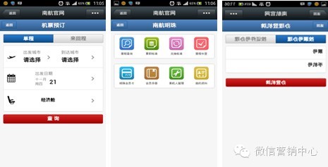 中国南方航空公司开通微信,在线值机丶查询里程丶航班动态丶办理登机牌丶机票预订丶票价查询丶明珠会员丶城市天气查询丶机票验真等这些以往只能在PC端实现的功能,在“南航官网”微信账号上都可以非常便捷地实现,微信账号已经成为一个的APP了。