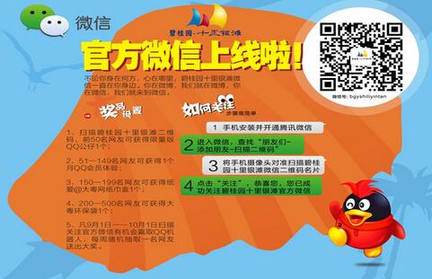 在国内各大开发商还在观望犹豫的时候,位于深圳东的碧桂园十里银滩瞅准先机,成为房地产行业第一个试水微信营销的开发商。碧桂园十里银滩还推出一系列优惠活动配合微信推广:扫描二维码,前50名网友可获得限量版QQ公仔一个,51-149名网友可获得1个月QQ会员体验等。由于是第一个吃螃蟹的,碧桂园十里银滩号当天引来各方人士关注。