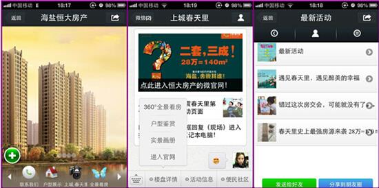 房地产是一个非常需要广告投入的行业,比如户外广告、电视广告、报告等等,因此,面对超过6亿的微信用户,瞄准于微信营销是完全正确的。为了更好的了解和运用房地产行业微信营销,电商中国小编梳理了2014年房地产微信营销十大经典案例,其中部分案例来自互联网,欢迎补充。