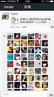 2014年2月24日金大地龙湖中心发起只要关注龙湖中心微信账号,并且转发推送的信息至朋友圈,就能领取品,转发的越多礼品越丰厚,10篇及10篇以上即可获得100元超市购物卡!并且,转发后的评论和集赞只要达到一定数量,也可领取品,100个评论或者赞就能赢取500元的超市购物卡一张,对于微信好友比较多的市民朋友而言,抢到大礼绝对是分分钟的事。