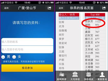 广夏集团与国内最大的微信营销服务商微信生意宝合作,定制微信报名入口,将登山节活微信游戏的方式呈现,参与者填写姓名电话即可生成专属活动页面,将该页面分享给朋友,只要朋友参与即可增加参与者的助力数,该助力数觉得抽的资格,并且助力数最多的50人将在页面上呈现,旁边就是参与者的助力数以及好友助力名单。丰厚的品+有趣的游戏,使得该活动的微信朋友圈引起病毒,8天时间就吸引了30万人参与。目前助力数第一的参与者已经成功邀请了1122人参与了活动。