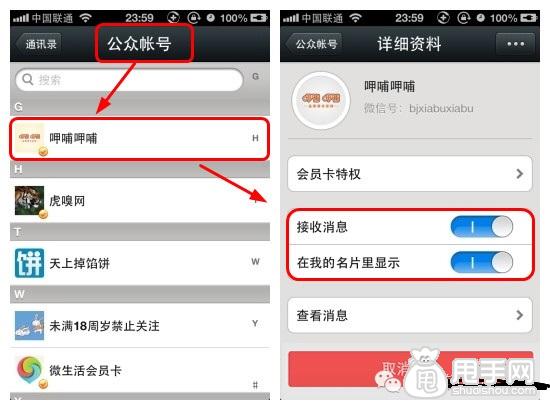 微信可以说是全面发展,不仅将微博平台的@功能照搬到了群组功能中,还将微博平台最火热的某某明星认证微博的方法,也照搬到了微信平台上,这就使得你可以在微信平台关注这些明星微信,当然,就不知道,而有的人仅仅想让自己不那么奇葩,别人都关注了自己不关注几个,好像自己很另类,但关注后又不想收到一些没营养的推送信息,其实你可以在通讯录账号内点击个别账号,关闭接受信息提醒,同时像什么杜蕾斯账号,微信还支持是否显示名片操作。