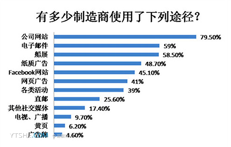 总体来看,船展和邮件营销也非常有效。64%的受访者曾经参与过船展,61%的人称会使用邮件营销。另外有半数受访者表示也会使用Facebook和平面广告。