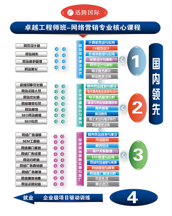 迅腾国际卓越工程师班—互联网营销与推广专业课程共分为四个阶段:
