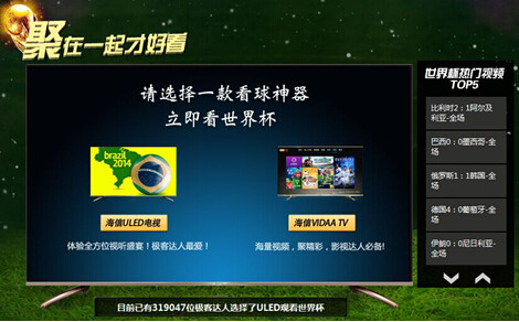 海信此次世界杯线上体验活动联手PPTV共同开展,PPTV提供最新高清世界杯视频,网友可选择在ULED或VIDAA2电视模式观看比赛。据统计,截止6月19号,已有近百万网友访问专题页面,其中有将近70万网友参与了在线视频体验。