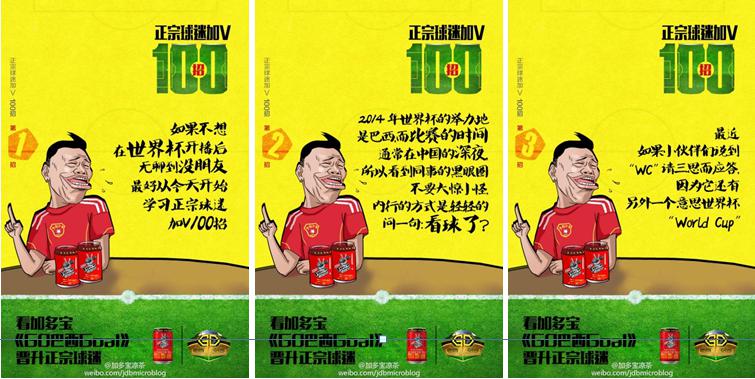 加多宝还与CCTV5合作,邀请球迷看《GO巴西GOAL》做正球迷。除了借助电视栏目进行推广,加多宝也在微博上开设了#正球迷加V100招#活动,以趣味海报的形式向网友普及足球小知识,帮助网友晋升正球迷。