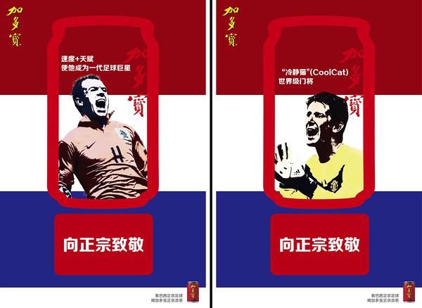 今年5月,加多宝携巨型红罐亮相“正足球王国”巴西,邀请巴西球星贝贝托到现场助阵,了“看巴西正足球,喝正凉茶”的营销之旅。同时,加多宝在微博上发布了一系列主题为“加多宝世界杯之旅向正致敬”的海报,再一次突出营销主题。