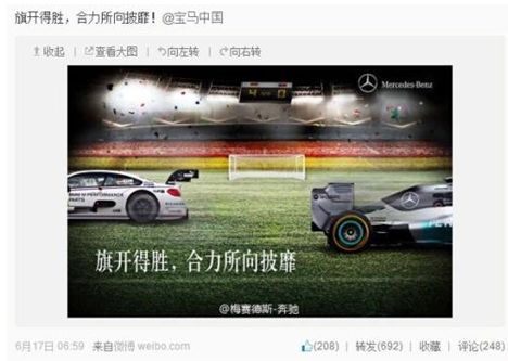 如果要说这届世界杯让你人感觉最“逗比”的话题,毫无疑问是奔驰宝马联手搞基了。6月17日,在德葡大战前夕的22:47分,奔驰和宝马的微博、微信同时发出了两条几近相同的内容,配图一模一样。这则消息一经发布,立即成了微博、微信讨论最热烈的话题之一。一方面,奔驰、宝马的公关公司主动请了一些大V帮助,另一方巾,这个话题确实很“逗比”,具有基础,之前在车展和端午节的时候奔驰、宝马、奥迪三大品牌就玩过这种“搞基”的游戏,而且取得了非常不错的效果。此次世界杯期间,奔驰、宝马再次联手玩这种手段,自然是驾轻就熟,也更加熟练,也就理所当然地能界杯话题的重压下找到自己的空间。