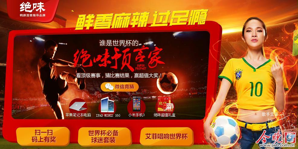 “你买的谁?几比几?”尽管2014巴西世界杯跌宕起伏,德巴大战7:1的比分惊世骇俗,但不管是真球迷还是伪球迷们,其关注的焦点纷纷已经从球技的讨论转向了赛事竞猜,甚至有人声称,看球的唯一动力就是竞猜。绝味看准球迷的,界杯时抢鲜一步推出世界杯竞猜活动。